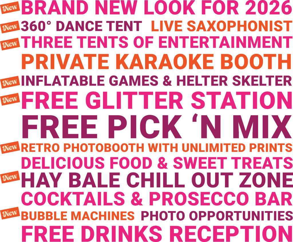 It gives you access to a HUGE line up of entertainment including: a 360֯֯ dance tent with live DJs and a saxophonist, a private karaoke booth, inflatable games and helter skelter, FREE glitter station, FREE pick ‘n mix station, a retro photobooth with FREE unlimited prints, a hay bale chill-out zone, bubble machines and more across THREE tents of festival-style entertainment.